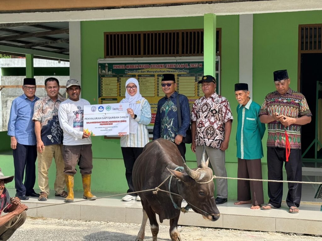 Selanjutnya, penyerahan sapi qurban dari BGTK Provinsi Riau disalurkan kepada dua penerima manfaat, yaitu SMK Taruna Muhammadiyah Okuran dan Pimpinan Cabang Muhammadiyah (PCM) Rumbai Timur. Prosesi penyerahan berlangsung di Masjid At-Taqwa dan turut melibatkan Lazismu Riau sebagai mitra distribusi. Acara ini juga disaksikan oleh Bapak Dr. H. Sutarmo, M.A., sebagai Koordinator Majelis Dikdasmen dan PNF PWM Riau.